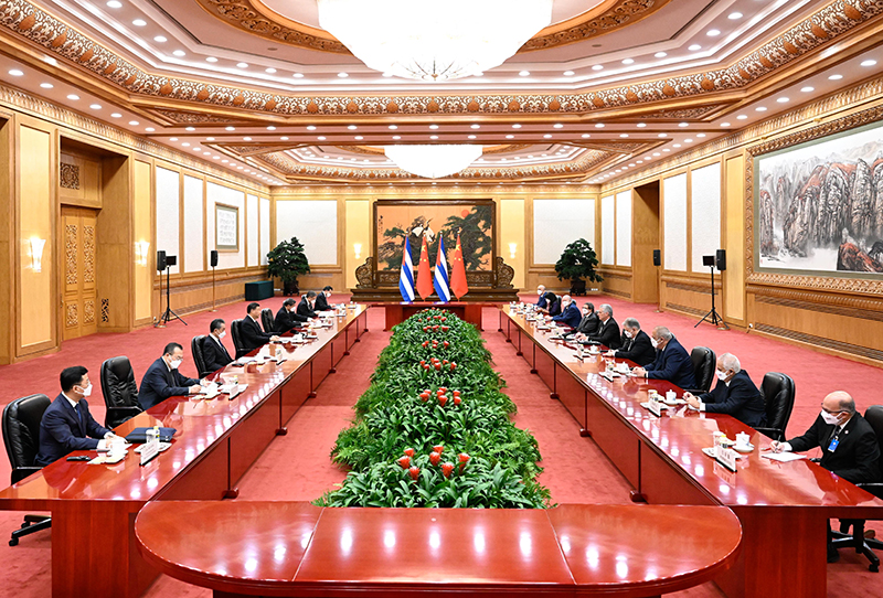 习近平指出,你是中共二十大后首位访华的拉美和加勒比国家元首,充分体现了中古两党两国的特殊友好关系。古巴是西半球第一个同新中国建立外交关系的国家,中古关系成为社会主义国家团结合作、发展中国家真诚互助的典范。中方愿同古方不断深化政治互信,拓展务实合作,在涉及彼此核心利益问题上坚定相互支持,在国际和地区事务中加强协调配合,在建设本国特色社会主义道路上携手并进,不断深化新时代中古关系。