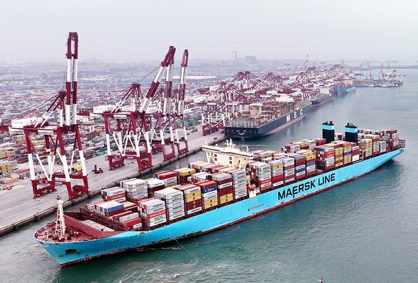 在山东港口青岛港前湾码头,欧洲贸易航线的“美途马士基”集装箱货轮解缆起航(2022年7月29日摄,无人机照片)。新华社记者 李紫恒 摄