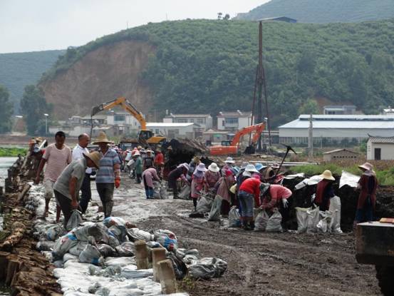 由于不断降水,异龙湖水位不断上涨。导致过细一线坝埂出现漫水现象,为了不使周边百姓不受影响,我局立即组织100余名人员,三台挖机进行坝埂加固加高,第一时间做到了防汛抗洪。