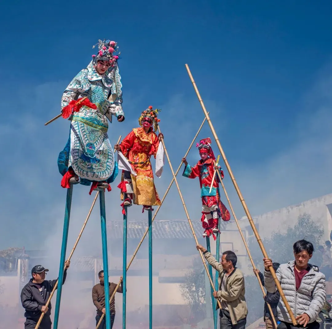 当地人认为踩高跷能祈求来年风调雨顺、六畜兴旺、五谷丰登。龙武踩高跷的历史传承已有上百年,表演者的年龄从7岁到60岁不等。其高跷最高的达一丈二尺,最矮也有七尺。