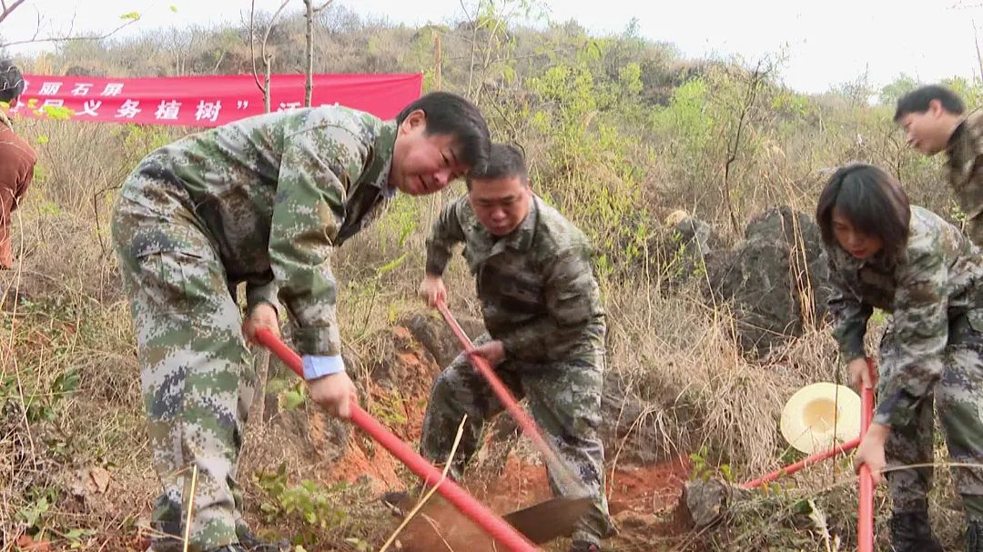 植树活动现场,县领导和广大干部职工、青年志愿服务队队员一起投入到植树活动中。大家个个热情洋溢、干劲十足,两人一组或三五成队,挖坑种树、铲土培实、提桶浇水,大家分工明确,合力将一棵棵树苗植入树坑,种植现场一片热火朝天,经过一番紧张的劳动,一棵棵新栽种的清香木、黄连木等树苗昂然挺立,石屏大地再添新绿。