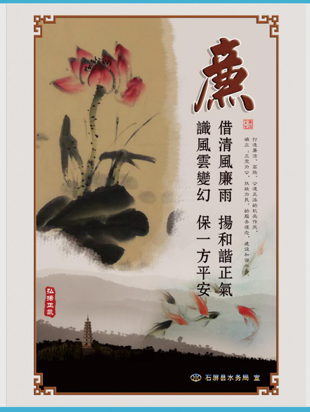 石屏县水务局为深入贯彻党的十八大、十八届三中、四中、五中、六中全会和习近平总书记系列重要讲话精神,推进“两学一做”学习教育常态化制度化建设,结合部门实际,紧紧围绕县委、县政府的中心,切实加强反腐败体制创新和制度保障,严明党的各项纪律,以“四种形态”夯实全面从严治党要求,唤醒责任意识,激发担当精神,着力建设过硬的水务干部队伍,深入推进党风廉政建设和反腐败工作,为水务事业健康发展提供坚强有力的纪律保证。结合政务公开、机关作风等工作实际,在办公区域创建一定规模的“廉政文化走廊”,用图文并茂的廉政格言警句,营造浓厚的廉政文化氛围,让廉政文化融入到党员干部职工的日常工作中。激发广大机关党员干部进一步增强建设美丽家园的自信心,注重道德修养,培养良好的精神面貌、价值观念和敬业精神,营造崇廉、敬廉、爱廉的良好社会风气,形成优良的人格品质和廉洁操守。