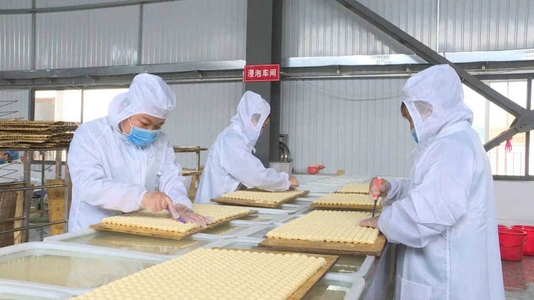 在云宴豆制品有限责任公司的生产车间,工作人员经过煮浆、点制、包浆、压制、切块等工序,豆腐块、小豆腐等产品被一一生产出来上线销售。今年受新冠肺炎疫情影响,公司果断改变生产方式,在传统豆腐块的基础上,推出了迷你小包浆豆腐、爆米花豆腐等新品种,迅速抢占市场,成为了新晋网红。