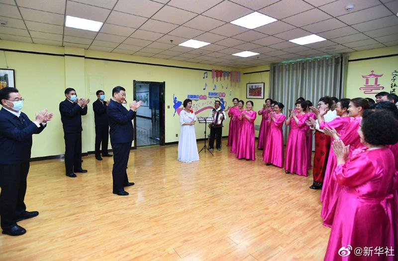 6月7日至9日,中共中央总书记、国家主席、中央军委主席习近平在青海考察。这是7日下午,习近平在西宁市城西区文汇路街道文亭巷社区舞蹈室,观看退休人员歌曲排练。新华社记者 谢环驰 摄
