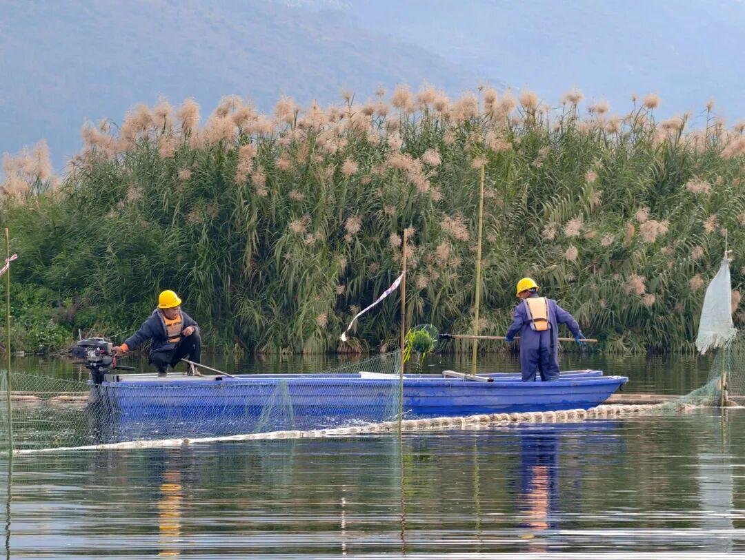 图为异龙湖水生态修复项目区内两名工程维护人员正在打捞杂草。 蒋朝晖摄
