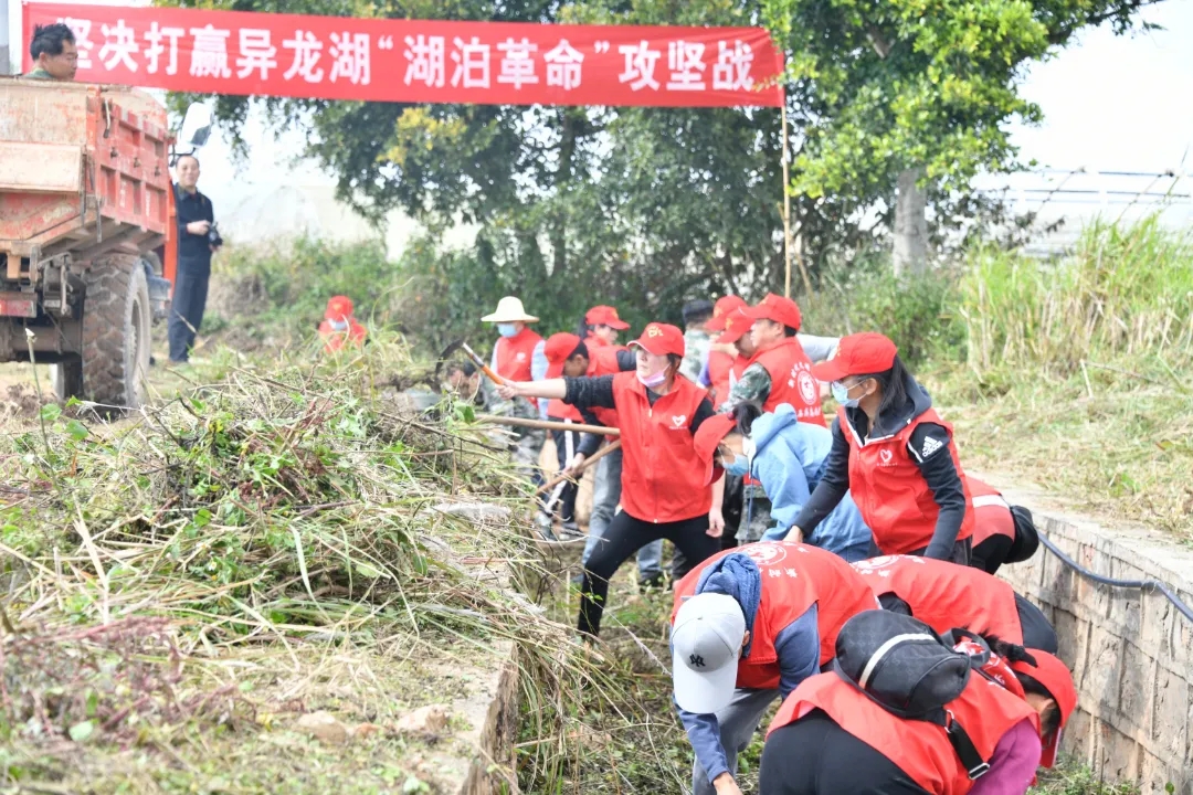 在异龙湖北岸大水河,县委书记张鹏程及李宏、周瑞等领导,各级河湖长、党员干部群众、巾帼连心服务队员、志愿者等130多人手拿镰刀、铁锹、锄头等工具,沿河道展开清理。虽然寒冬依旧,但大家的热情不减,为了保护秀美异龙湖,率先垂范,以身作则清理河道。