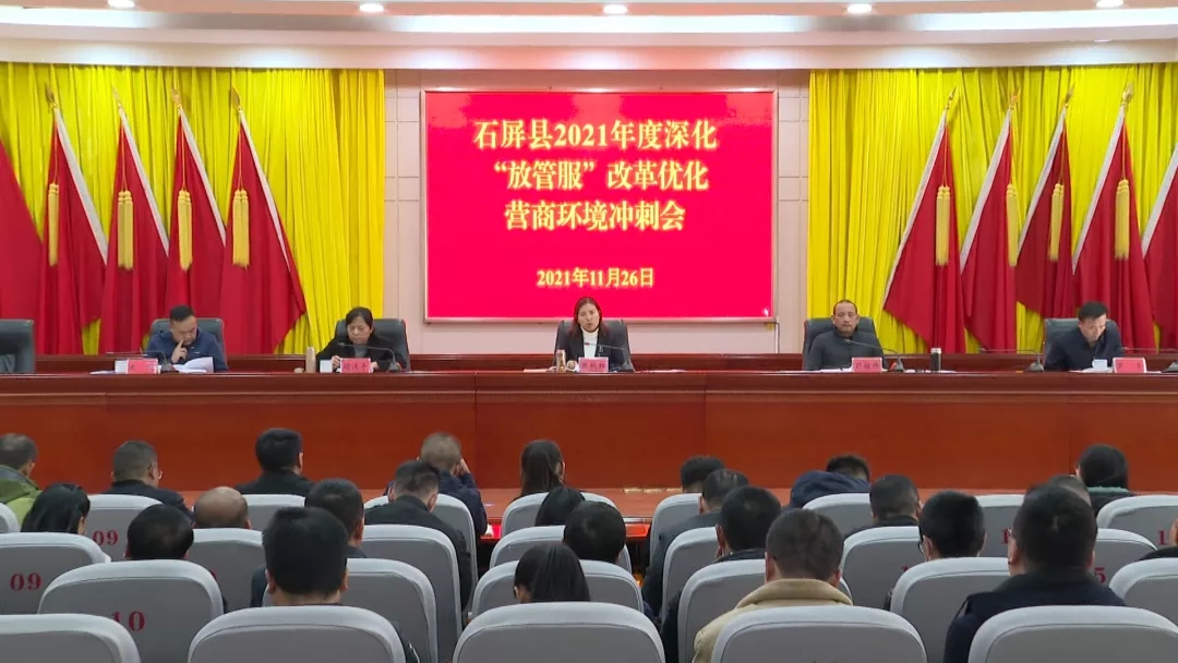 11月26日,石屏县召开2021年度深化“放管服”改革优化营商环境冲刺会议,县委副书记、县长张秋红,副县长胡连平、彭继伟、朱超、罗亮,以及各乡镇主要领导、相关部门负责人参加会议。