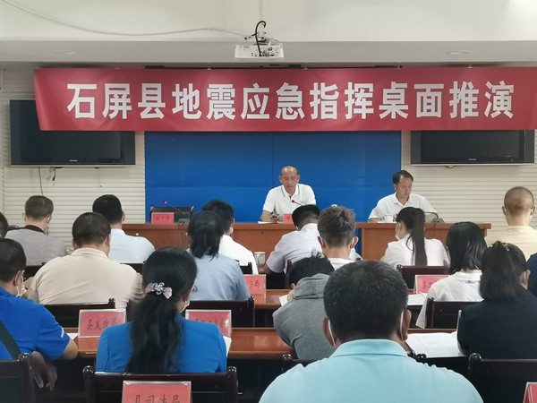为进一步熟悉掌握应对重大地震灾害的应急响应工作内容和流程,提高指挥部决策、指挥和协调能力,加强部门之间的信息沟通、资源共享、协作联动,确保地震发生后能够迅速、高效、有序开展地震应急工作。石屏县于2022年6月22日开展了地震应急指挥桌面推演,县抗震救灾指挥部全体成员单位分管领导和县地震局干部职工共计52人参加了会议,县人民政府副县长彭继伟参加推演并讲话。