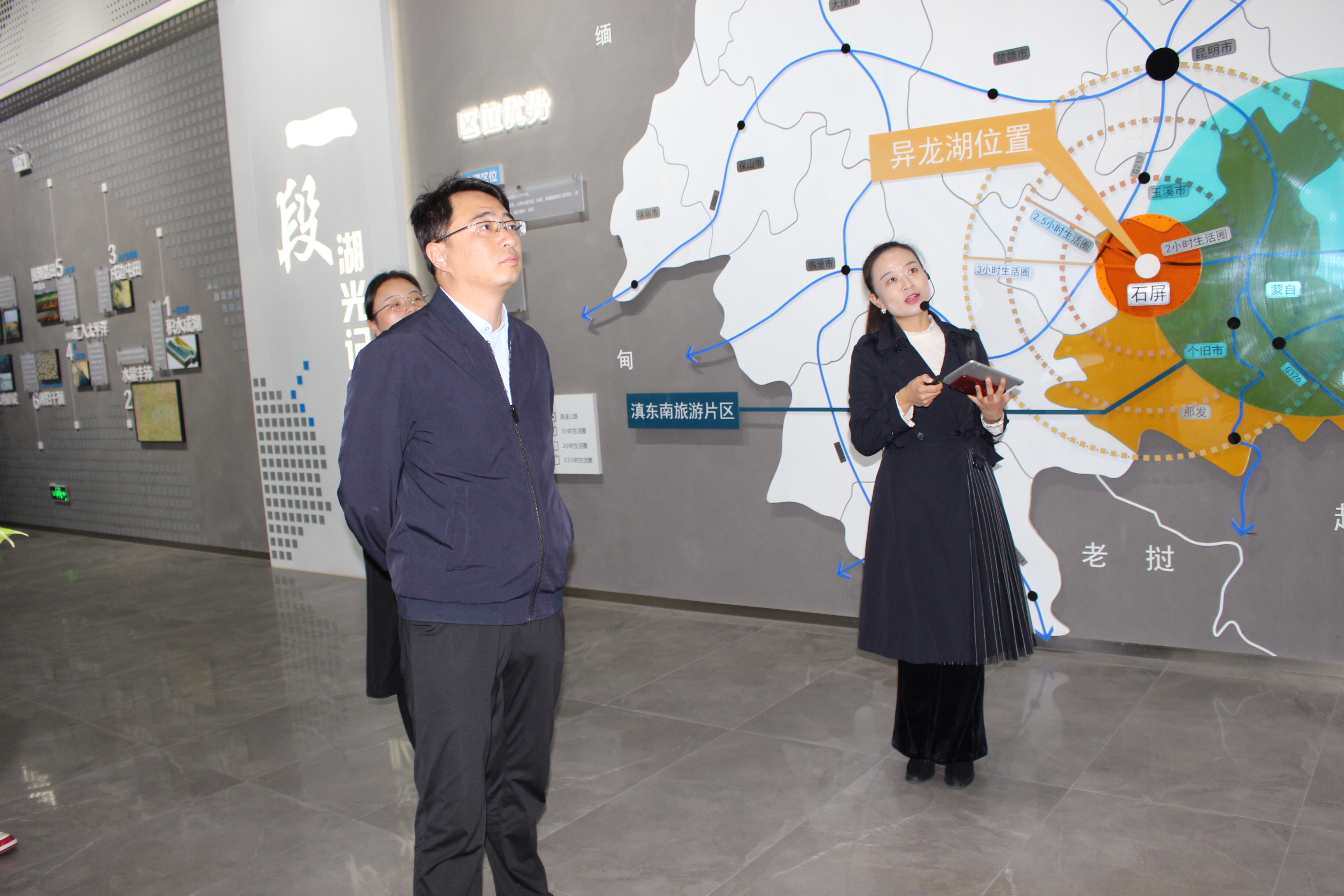 随后,调研组一行走进异龙湖保护治理规划展示馆。和吴云书记认真听取了石屏县开展异龙湖保护治理工作举措和取得的主要成果,并向团县委负责人详细了解了近年来开展“保护母亲湖”志愿服务行动的组织动员、工作机制、具体行动和宣教成效等情况。