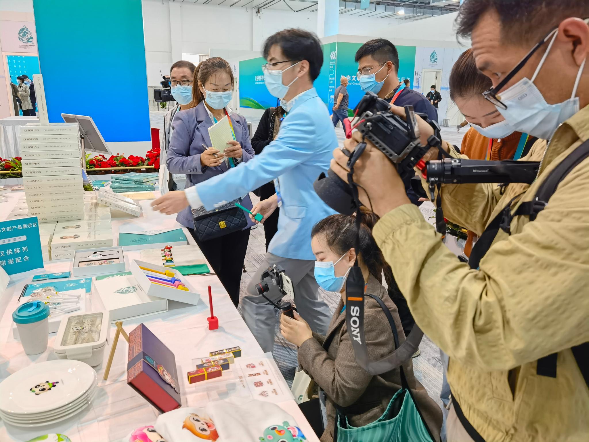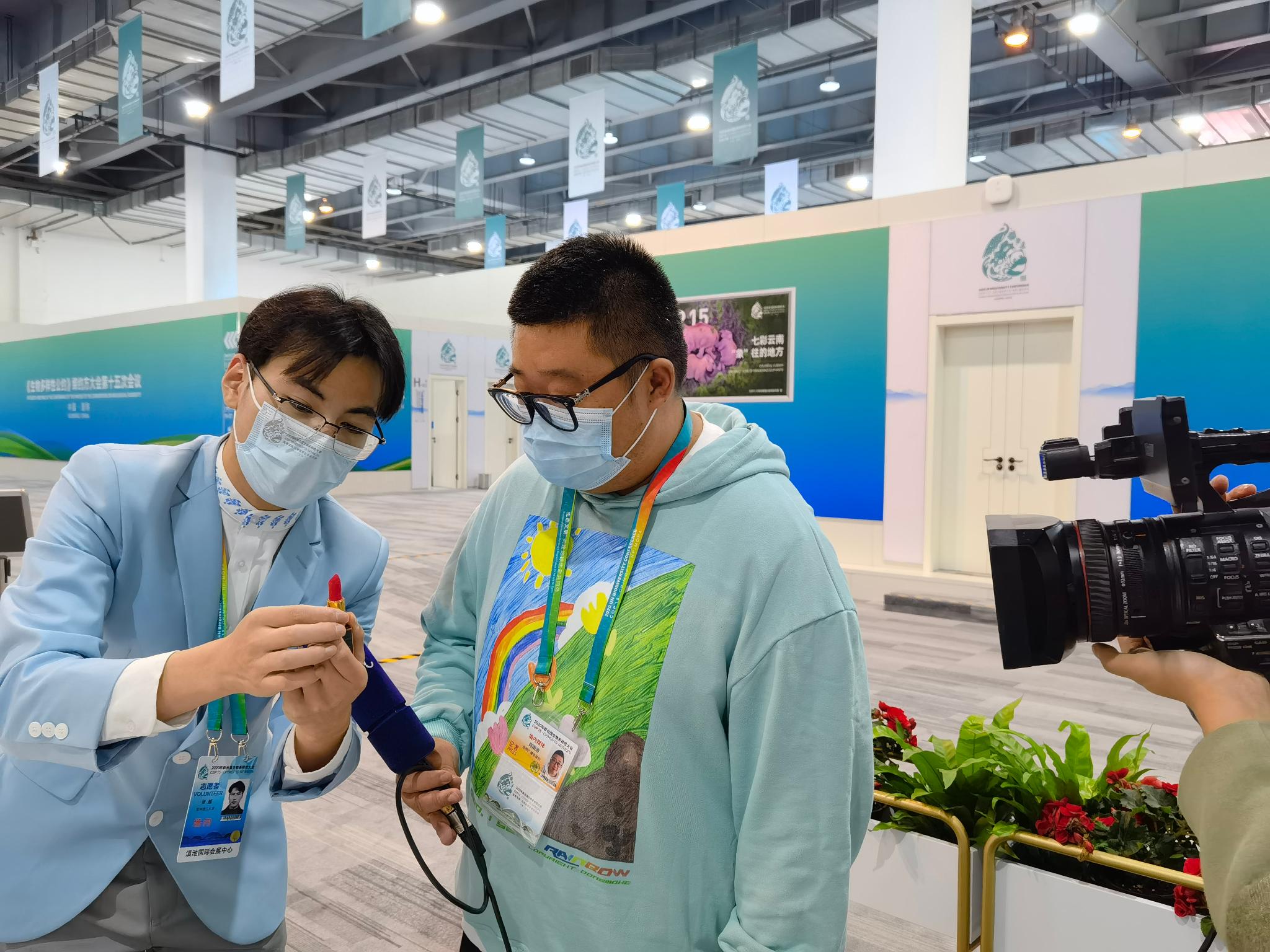 不仅如此,在COP15大会上,石屏的非遗文创也成为了瞩目的焦点。在新闻中心内的文化展示区内,挤满了参会记者,大家在这里可以翻看、取阅各类介绍云南生物多样性的书籍、杂志,还有COP15相关的各类文创产品。其中,外壳满是石屏花腰彝元素的天竺葵精油口红引来来了现场不少小姐姐的关注,成为展示区内的热门“宠儿”。