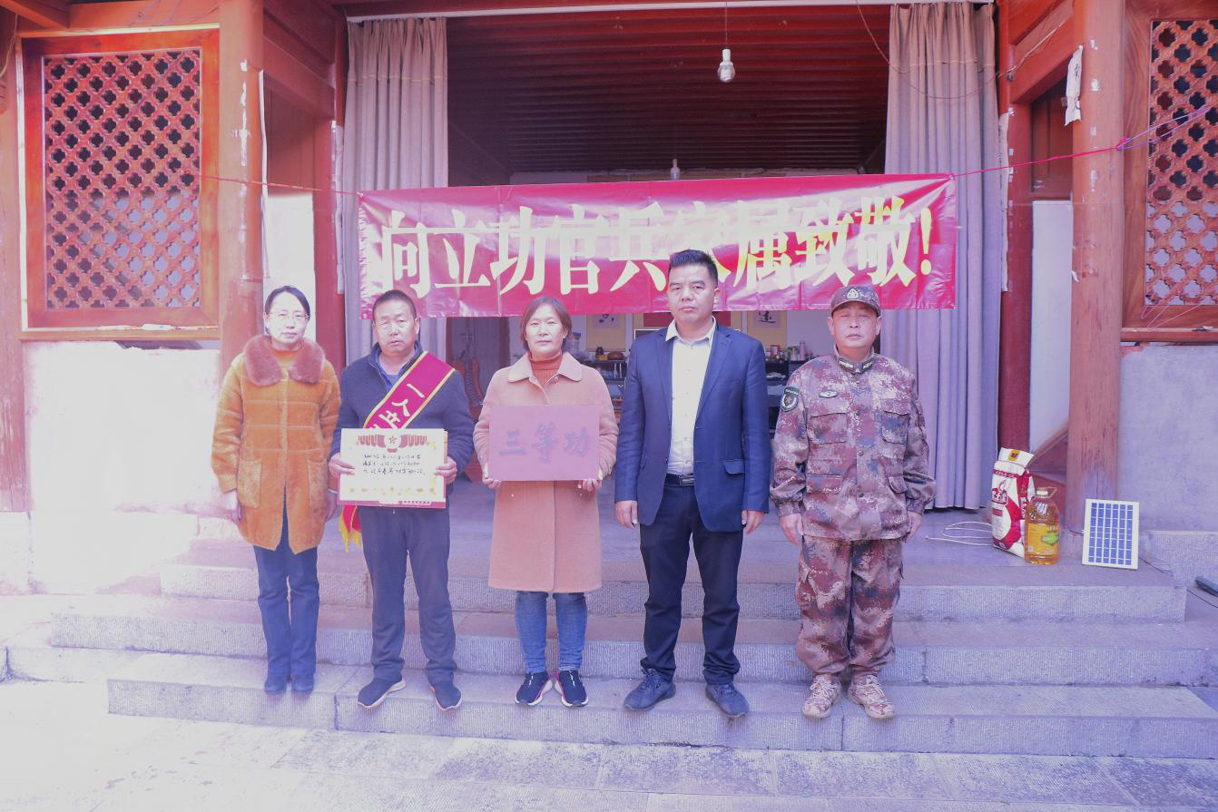 “一人当兵,全家光荣。”为进一步弘扬拥军优属的光荣传统,营造尊重关爱功臣模范的浓厚社会氛围,激发石屏县现役军人在部队安心服役,家属全心支持子女投身军队和国防建设热情。2022年1月26日,石屏县退役军人事务局领导和县人武部同志一行来到荣获三等功的现役军人李秘家中,将立功受奖喜报和奖励金送到军属手中,并向其军属表达了祝贺。详细了解李秘的家庭情况,对他们为国家培养优秀人才表示衷心感谢,并希望军人家属继续鼓励孩子在保家卫国的神圣岗位上再接再厉、再创佳绩、再立新功。
