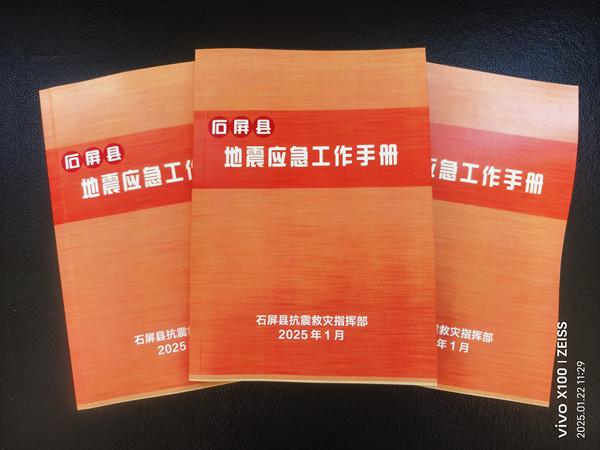 该手册系统收录了习近平总书记关于防震减灾工作的重要论述、石屏县历时地震活动情况、地震应急预案和处置方案、应急物资储备和应急通信设备情况等内容。2025年1月21日政府常务会要求各单位要组织学习该手册,熟悉各自职能职责,指导地震应急演练,在地震发生后能快速反应、有序组织、协同作战。