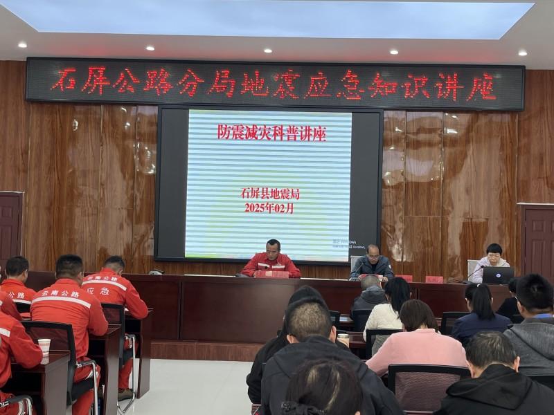 2025年2月26日下午,石屏公路分局开展地震应急知识讲座及地震应急演练,石屏县地震局龙学贵副局长、高级工程师孔跃玲应邀到石屏公路分局开展防震减灾科普知识宣传活动。