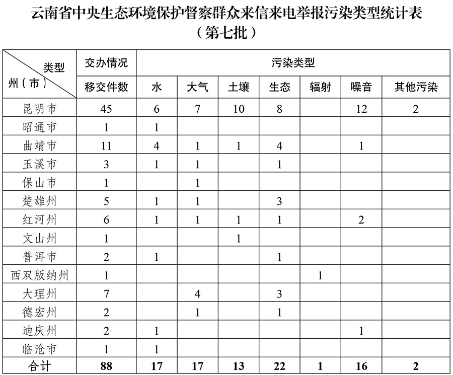 5月16日,中央第七生态环境保护督察组向云南移交第七批群众信访举报件88件,其中,来电举报56件,来信举报32件。从信访举报件生态环境问题污染类型来看,涉及水17件、大气17件、土壤13件、生态22件、辐射1件、噪音16件、其他污染2件。从区域分布上看,昆明市45件、昭通市1件、曲靖市11件、玉溪市3件、保山市1件、楚雄州5件、红河州6件、文山州1件、普洱市2件、西双版纳州1件、大理州7件、德宏州2件、迪庆州2件、临沧市1件。截至当日,云南省已累计收到中央第七生态环境保护督察组交办的信访举报件492件,所有举报件均已及时转交相关州(市)处理。