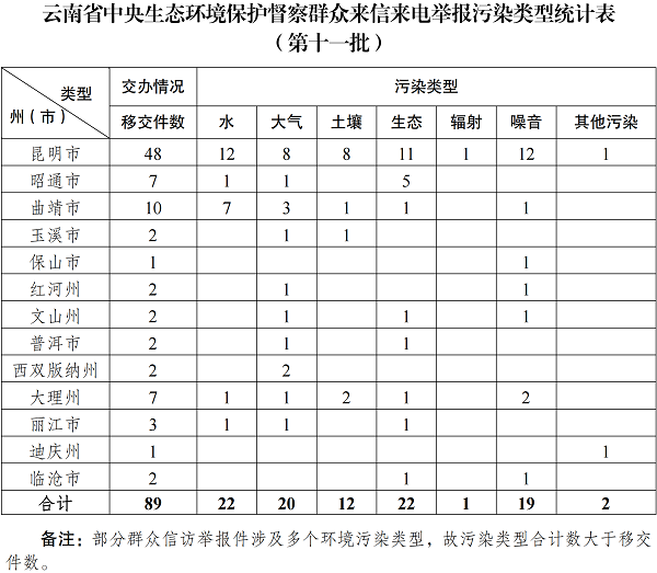 5月20日,中央第七生态环境保护督察组向云南移交第十一批群众信访举报件89件,其中,来电举报61件,来信举报28件。从信访举报件生态环境问题污染类型来看,涉及水22件、大气20件、土壤12件、生态22件、辐射1件、噪音19件、其他污染2件。从区域分布上看,昆明市48件、昭通市7件、曲靖市10件、玉溪市2件、保山市1件、红河州2件、文山州2件、普洱市2件、西双版纳州2件、大理州7件、丽江市3件、迪庆州1件、临沧市2件。截至当日,云南省已累计收到中央第七生态环境保护督察组交办的信访举报件860件,所有举报件均已及时转交相关州(市)处理。