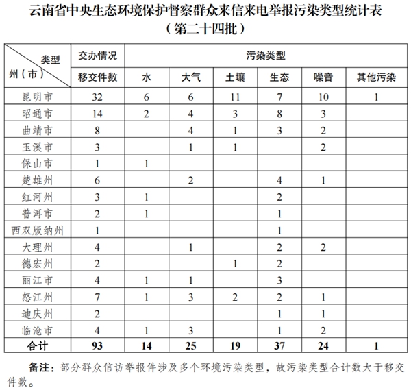 6月2日,中央第七生态环境保护督察组向云南移交第二十四批群众信访举报件93件,其中来电举报43件,来信举报50件。从信访举报件生态环境问题污染类型来看,涉及水14件、大气25件、土壤19件、生态37件、噪音24件、其他污染1件。从区域分布上看,昆明市32件、昭通市14件、曲靖市8件、玉溪市3件、保山市1件、楚雄州6件、红河州3件、普洱市2件、西双版纳州1件、大理州4件、德宏州2件、丽江市4件、怒江州7件、迪庆州2件、临沧市4件。截至当日,云南省已累计收到中央第七生态环境保护督察组交办的信访举报件2290件,所有举报件均已及时转交相关州(市)处理。