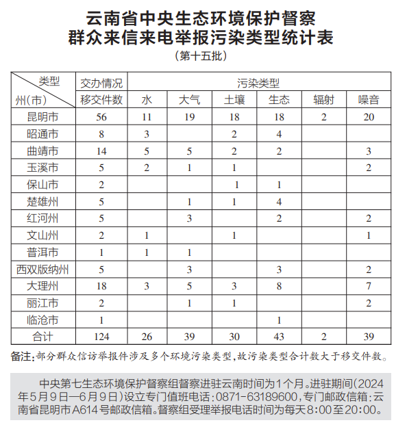 5月24日,中央第七生态环境保护督察组向云南移交第十五批群众信访举报件124件,其中来电举报57件,来信举报67件。从信访举报件生态环境问题污染类型来看,涉及水26件、大气39件、土壤30件、生态43件、辐射2件、噪音39件。从区域分布上看,昆明市56件、昭通市8件、曲靖市14件、玉溪市5件、保山市2件、楚雄州5件、红河州5件、文山州2件、普洱市1件、西双版纳州5件、大理州18件、丽江市2件、临沧市1件。截至当日,云南省已累计收到中央第七生态环境保护督察组交办的信访举报件1303件,所有举报件均已及时转交相关州(市)处理。