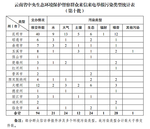 5月19日,中央第七生态环境保护督察组向云南移交第十批群众信访举报件94件,其中来电举报59件,来信举报35件。从信访举报件生态环境问题污染类型来看,涉及水21件、大气24件、土壤12件、生态24件、辐射1件、噪音28件、其他污染1件。从区域分布上看,昆明市40件、昭通市6件、曲靖市7件、玉溪市8件、保山市1件、楚雄州3件、红河州1件、普洱市2件、西双版纳州4件、大理州12件、德宏州1件、丽江市3件、迪庆州2件、临沧市4件。截至当日,云南省已累计收到中央第七生态环境保护督察组交办的信访举报件771件,所有举报件均已及时转交相关州(市)处理。