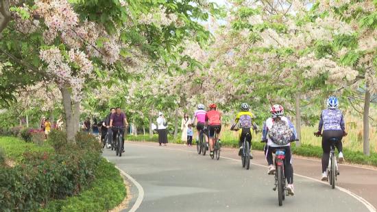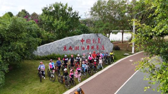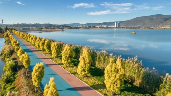 异龙湖环湖生态廊道作为“体育+旅游”融合发展的典范,以其独特的自然风光和完善的赛事设施,成为众多体育赛事的首选之地。它不仅是一条骑行赛道,更兼具固岸护坡、截污净水、生态修复、科普教育等多重功能。清晨或傍晚,漫步在异龙湖环湖生态廊道上,红蓝相间的赛道蜿蜒向前,与湖光山色相映成趣。这里四季景观各异,成为市民和游客们休闲锻炼、观光打卡的热门目的地。杨波作为一名自行车店负责人,对此深有感触:“这段时间加入骑行队伍的人越来越多,我在异龙湖边开着一个租车店,每到周末和节假日,租车去异龙湖骑行的游客很多。”